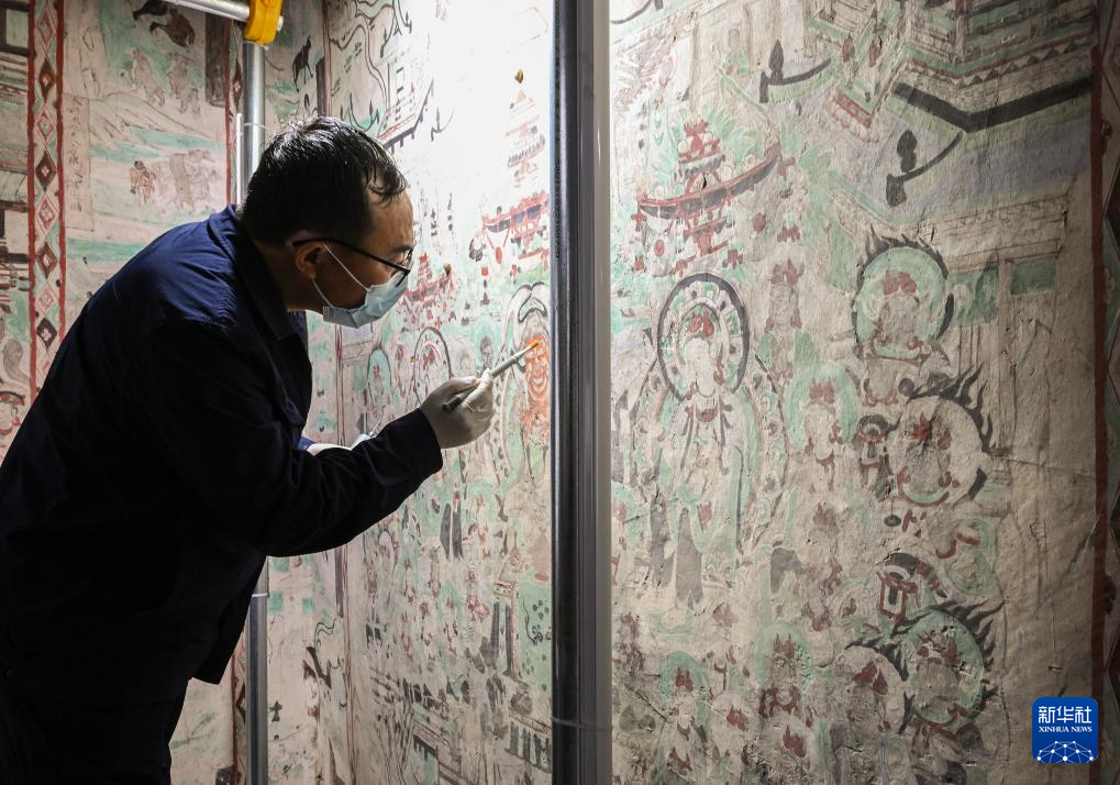 在敦煌莫高窟正在保护修缮的第55窟内,一位文保工作者对壁画进行修复(8月3日摄)。