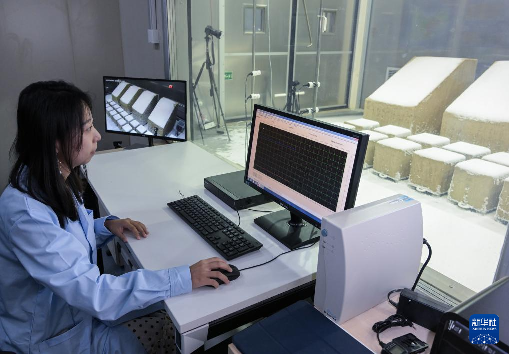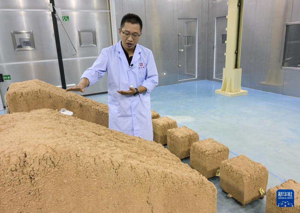 在敦煌研究院多场耦合实验室内,一位工作人员观察针对锁阳城夯土模型所进行的环境模拟实验情况(8月3日摄)。