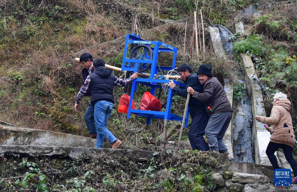 乌英苗寨村民们在搬运亮布机(2021年12月31日摄)。2021年,广西柳州市妇联和柳州市女企业家协会为乌英苗寨捐赠一批亮布机和捶布台,帮助村民提高亮布制作的效率。
