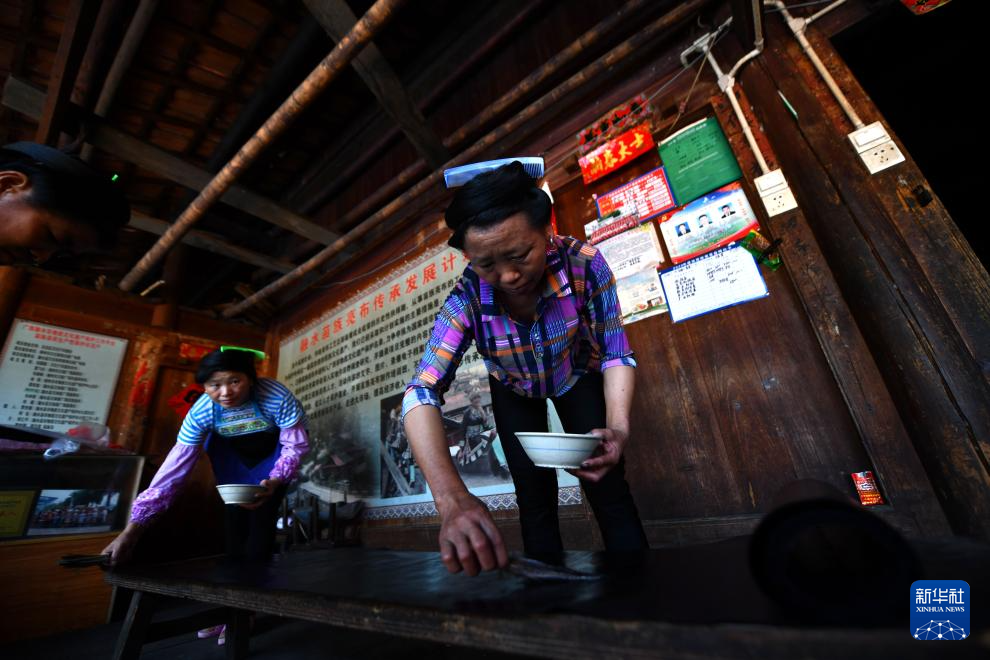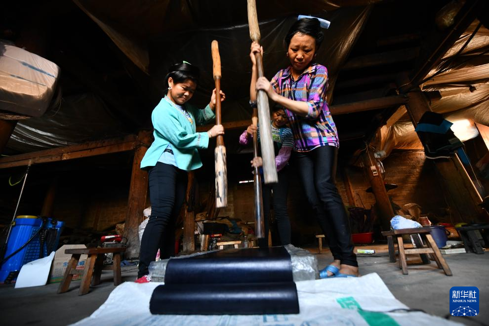 乌英苗寨妇女梁足英(右)在用传统亮布槌捶打布料(2023年8月31日摄)。