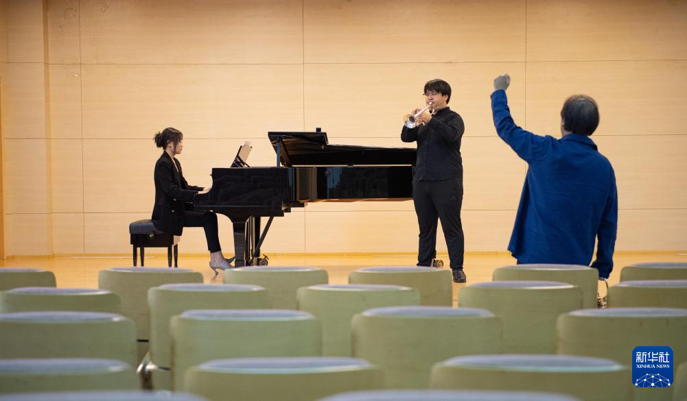 9月14日,中央音乐学院小号专业学生纪政旭(中)在陈光教授(右)指导下练习吹奏海顿的《降E大调小号协奏曲》。