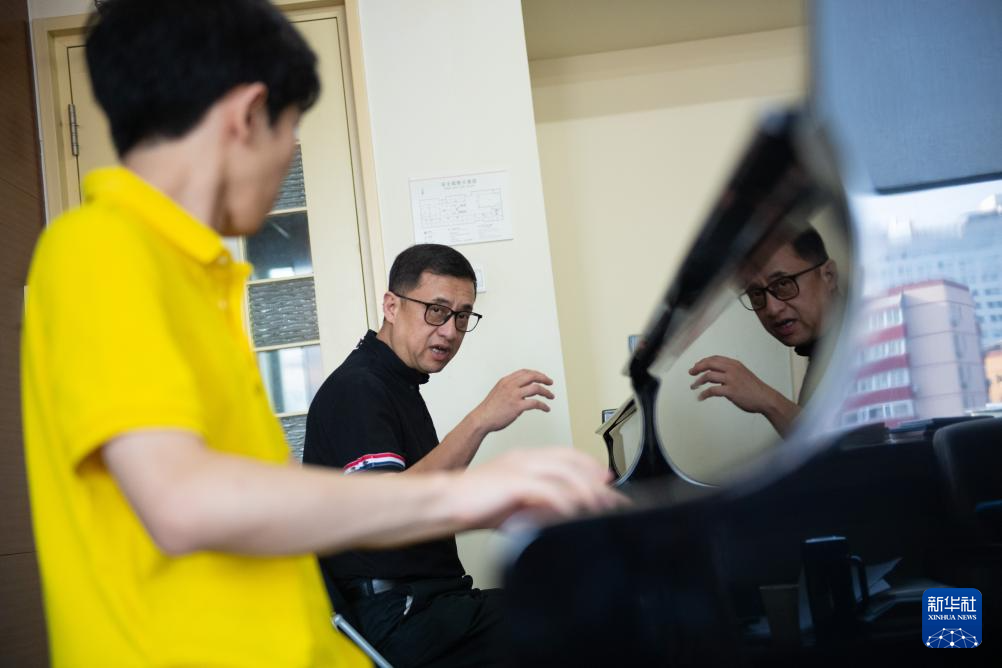 9月14日,中央音乐学院教授韦丹文(后)指导钢琴系学生练习莫扎特的《A大调钢琴协奏曲K.414》。