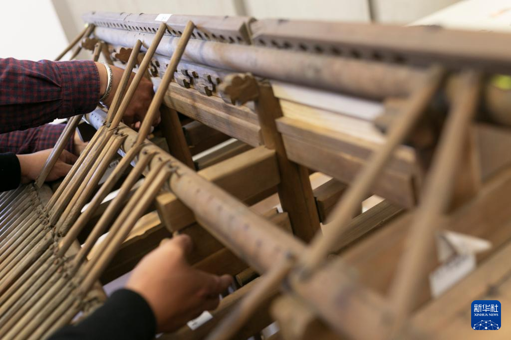 10月16日,在斯洛文尼亚卢布尔雅那的民族志博物馆,故宫博物院专家侯腾龙(左)、黄齐成修复中国古建筑室内装饰。