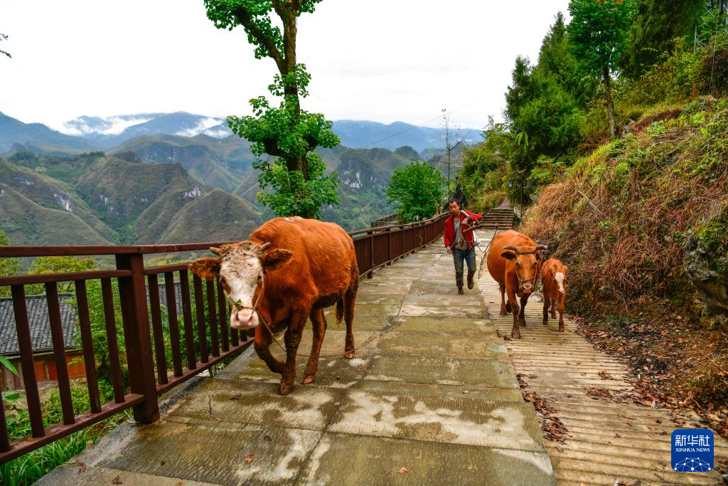 11月15日,贵州省石阡县国荣乡楼上古寨的村民放牛归来。
