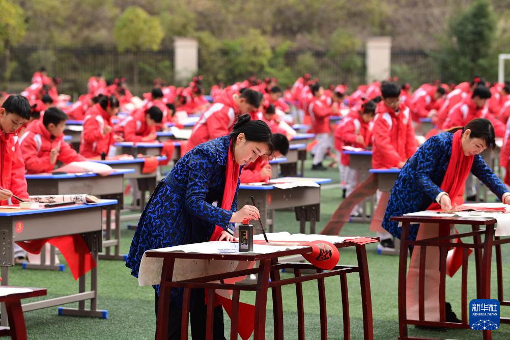 当日,江西省赣州市文清路小学举行师生集体写春联迎新春活动,学校师生在操场上挥毫泼墨,书写春联,迎接新春佳节。