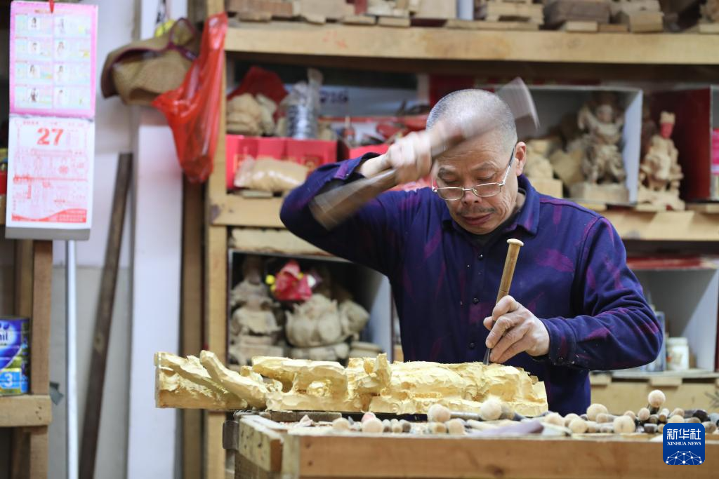 龙年春节将至,在福建省晋江市东石镇潘山村的木雕厂内,工人们加紧赶制出货订单,一件件精美的龙柱、龙头等庙宇木雕产品在工人们的精雕细琢中诞生。潘山庙宇木雕以庙宇雕刻为表现方式,历史悠久,工艺精湛,产品主要在海峡两岸销售,同时销往新加坡、印度尼西亚、菲律宾等东南亚国家。2021年,以潘山庙宇木雕为代表的泉州木雕成功入选第五批国家级非遗名录。