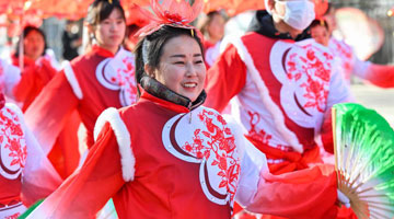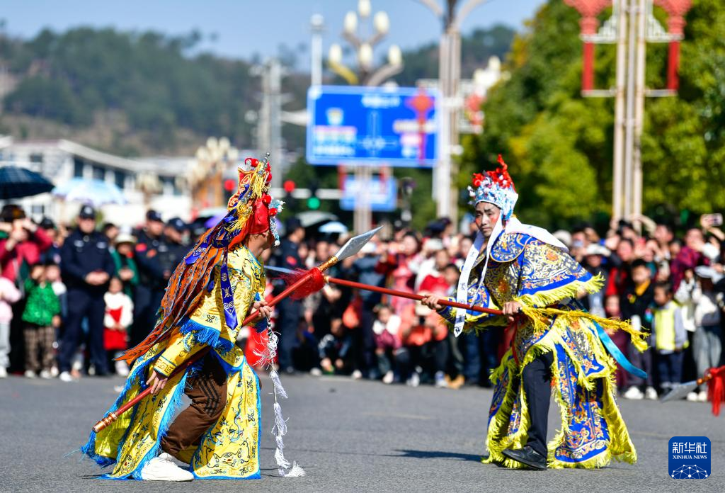 2月18日,人们在贵州省龙里县民俗踩街活动中表演太平花灯戏。