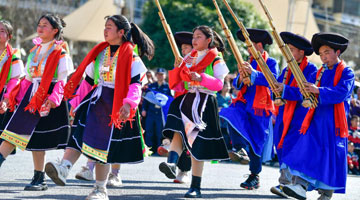 2月18日,人们在贵州省龙里县民俗踩街活动中跳芦笙舞。
