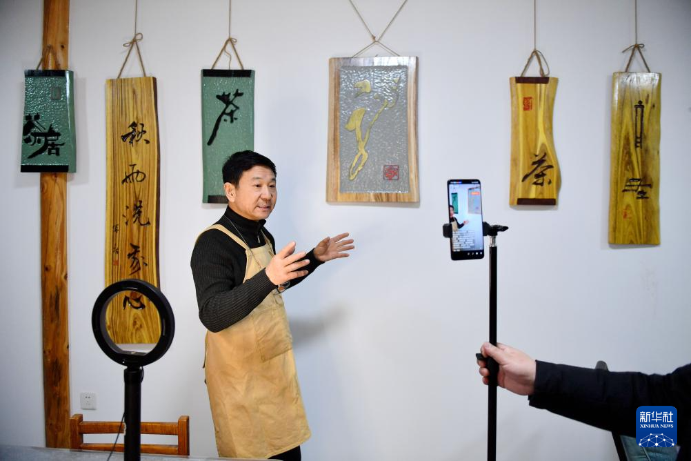 2月19日,非遗项目落花堂木刻传承人崔建军通过网络直播介绍木刻作品。