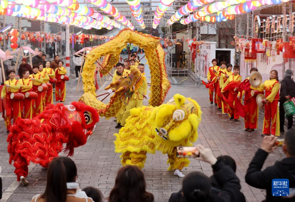 2月22日,在河南省博爱县北朱营村,村里的文艺队在表演舞狮。