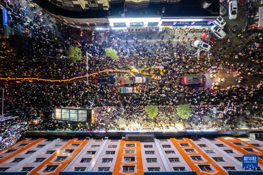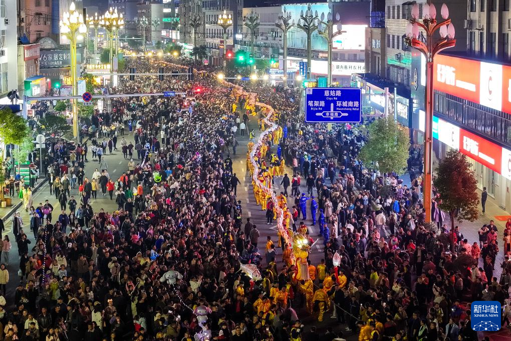 3月16日,板板龙灯队伍在慈利县慈姑中路上巡游(无人机照片)。