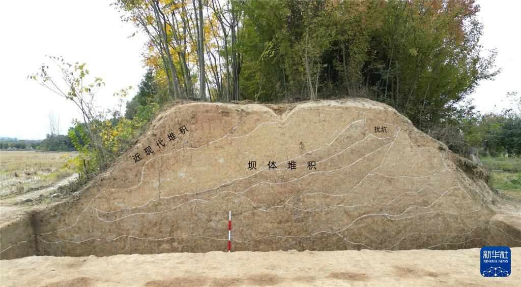 湖北荆门屈家岭遗址郑畈水坝剖面清理情况。