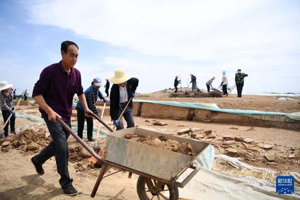 工作人员在甘肃省陇南市礼县四角坪遗址考古发掘现场工作(2022年6月10日摄)。