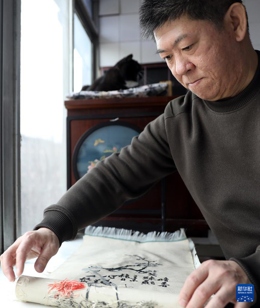 4月9日,申涛在位于营口市的家中对缂丝作品进行最后一道工序——修毛头。