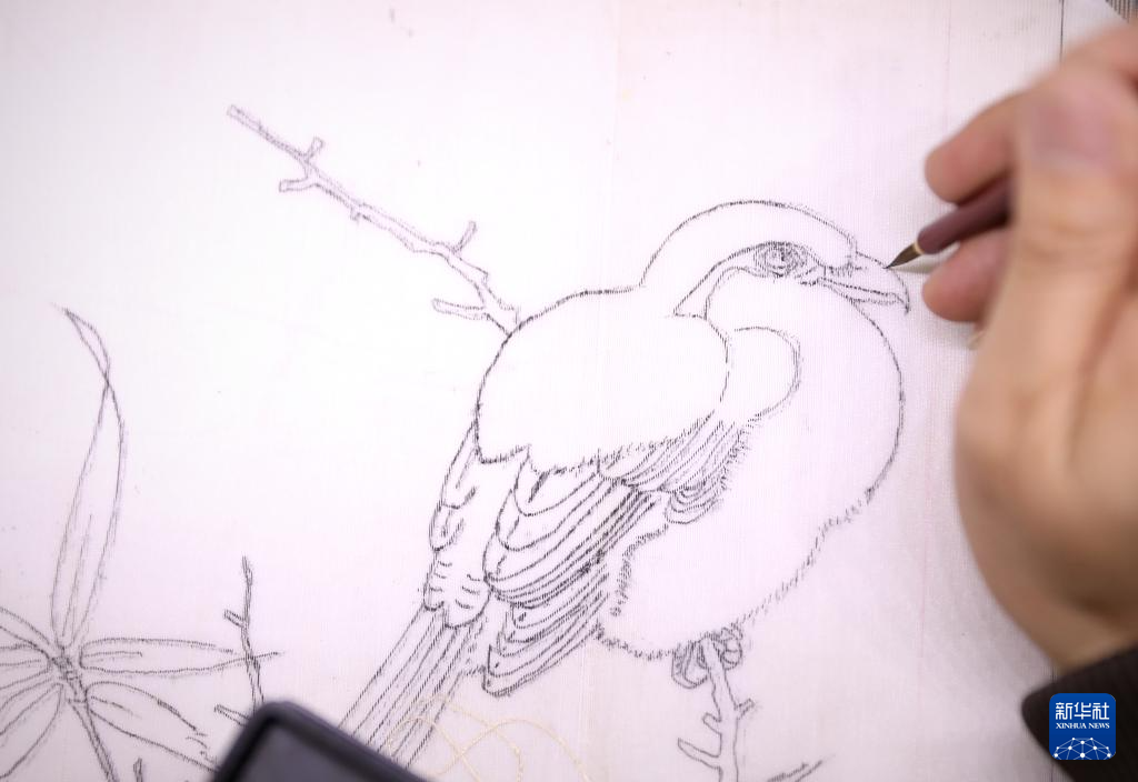 4月9日,申涛在家中的缂丝机的经面上描绘画稿。