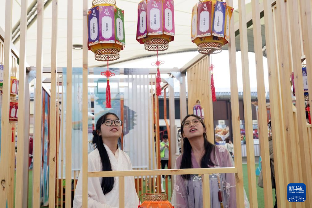 4月11日,华服爱好者在国风市集的互动体验区参与猜灯谜游戏。