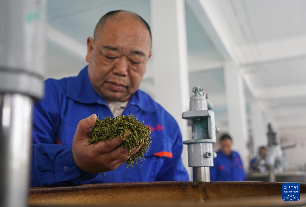 江西省修水县漫江乡的宁红茶制茶基地,俞旦华查看鲜叶的揉捻情况(3月29日摄)。