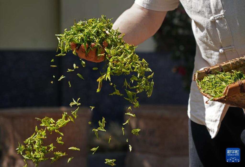 江西省修水县漫江乡的宁红茶制茶基地,俞旦华对茶叶进行传统萎凋工序(3月29日摄)。