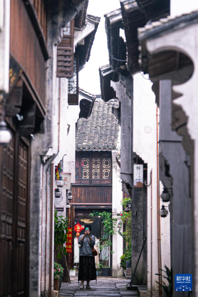 拼版照片:上图为1979年的嘉兴市月河历史街区坛弄(资料照片,庞艺影摄);下图为4月26日拍摄的游客在嘉兴市月河历史街区坛弄游玩(新华社记者江汉摄)。