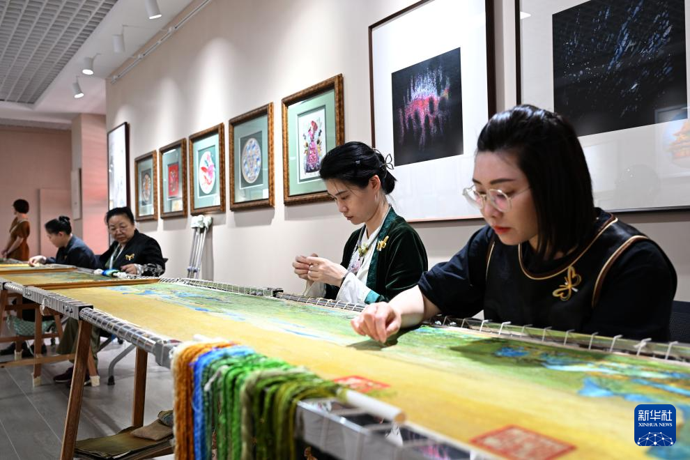 5月12日,残疾绣娘在展览现场绣制《千里江山图》。