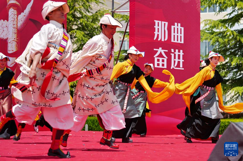 当日,西藏职业技术学院职业教育活动周在拉萨启动,那曲市比如县民族艺术团非物质文化遗产表演暨“乡村振兴 那曲奋进”旅游推介走进校园,激发人们对传统文化和特色旅游的兴趣。