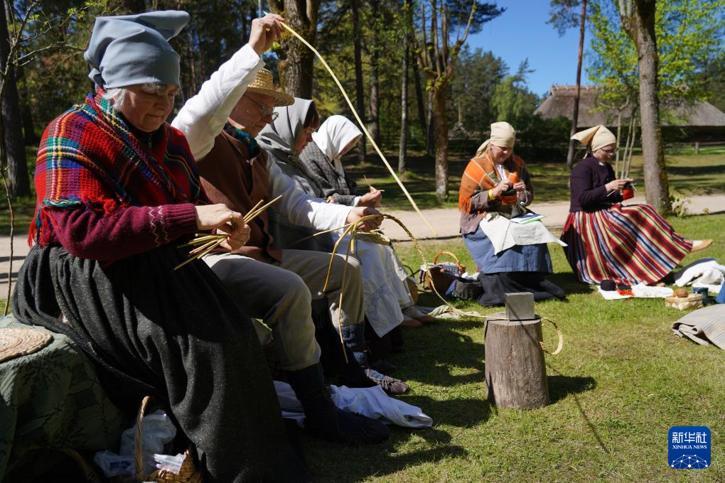 5月11日,在拉脱维亚里加市郊,人们在拉脱维亚民族志露天博物馆建馆百年庆祝活动上做手工。