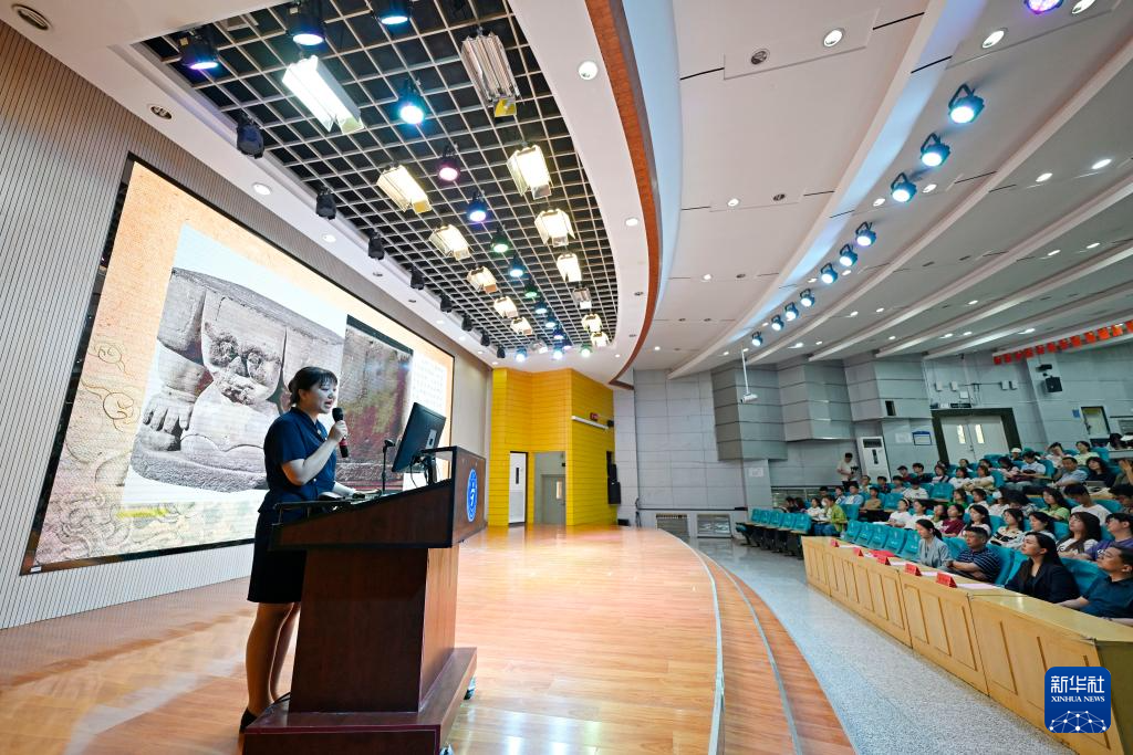 宁夏博物馆讲解员在宁夏医科大学为学生讲解文物知识(5月14日摄)。