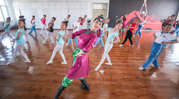 5月18日,在甘肃省定西市安定区博物馆,学生在陶罐上绘图。