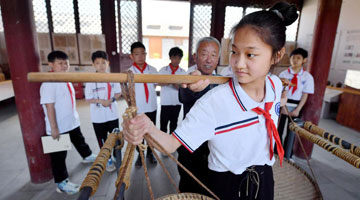 5月18日,小朋友在江苏省兴化市博物馆参观。