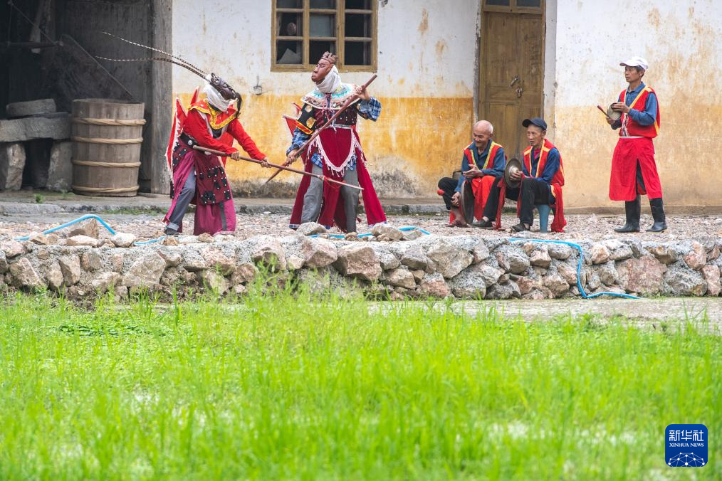 5月16日,在稻田旁的一间老屋前,戏班子成员在登台前熟悉表演站位。
