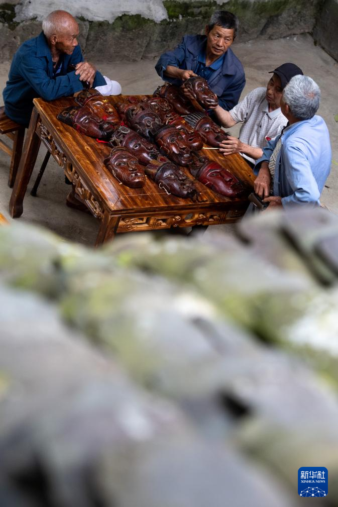 5月16日,在陈家老屋前的院坝,戏班子成员围坐在摆满阳戏面具的桌旁商量剧目、分配角色。