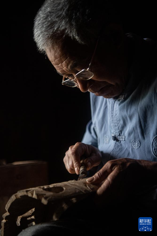5月16日,陈永霞在老屋内手工雕刻阳戏面具。