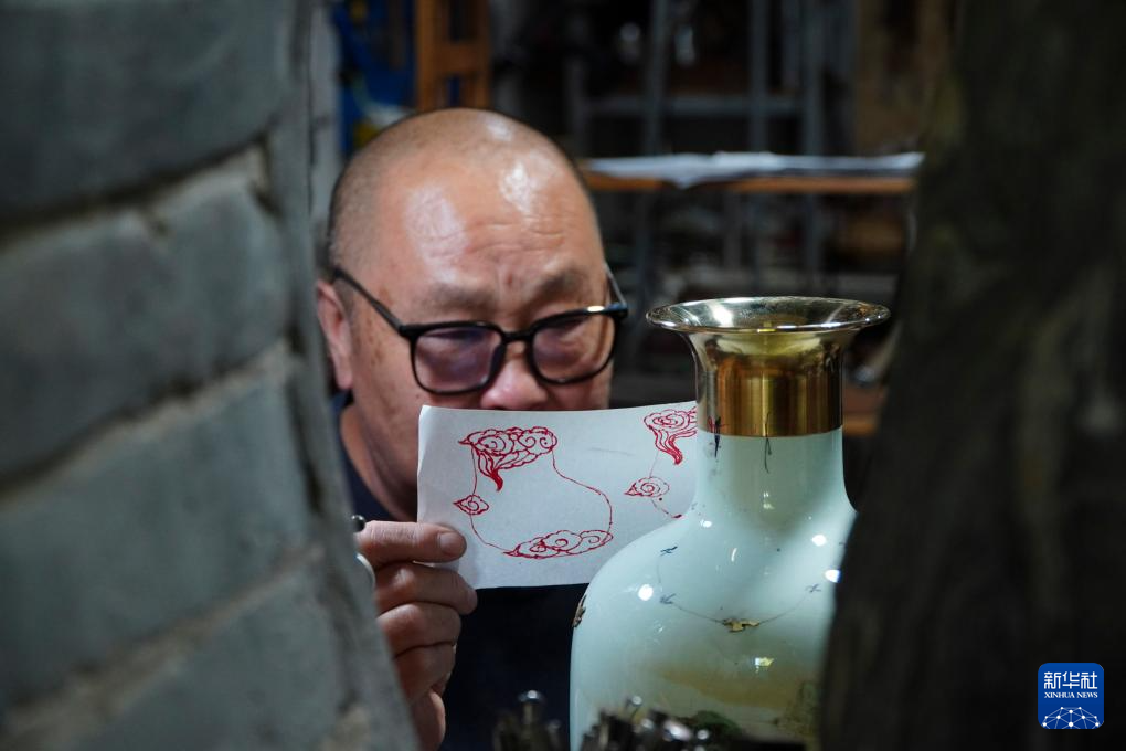 杨涛在工作室为破损的瓷器设计锔瓷修复方案(5月8日摄)。