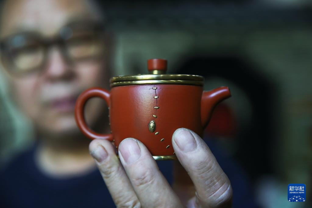 杨涛展示锔瓷修复的茶壶(5月8日摄)。
