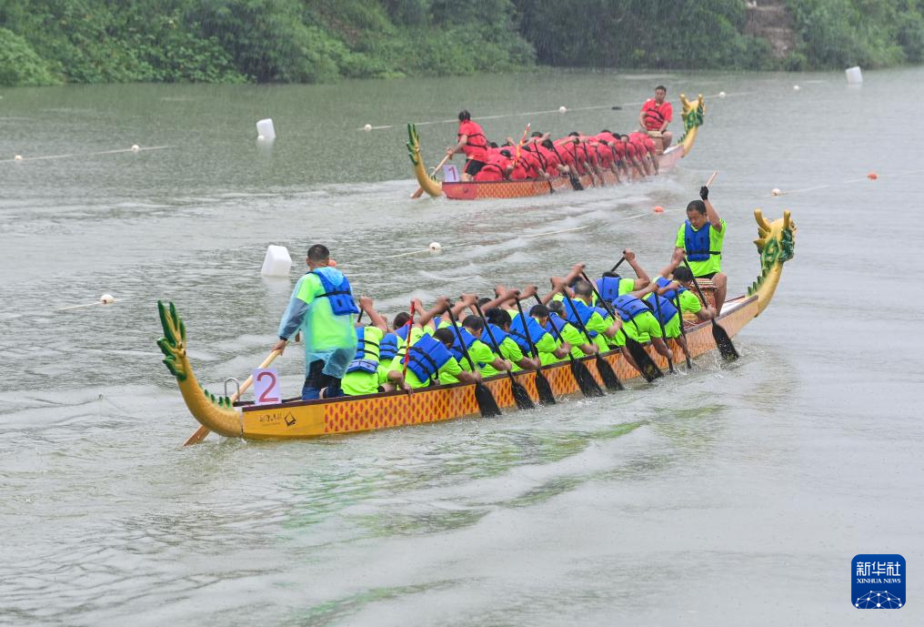 5月29日,在酉阳县龙潭镇,龙舟队在水面角逐。
