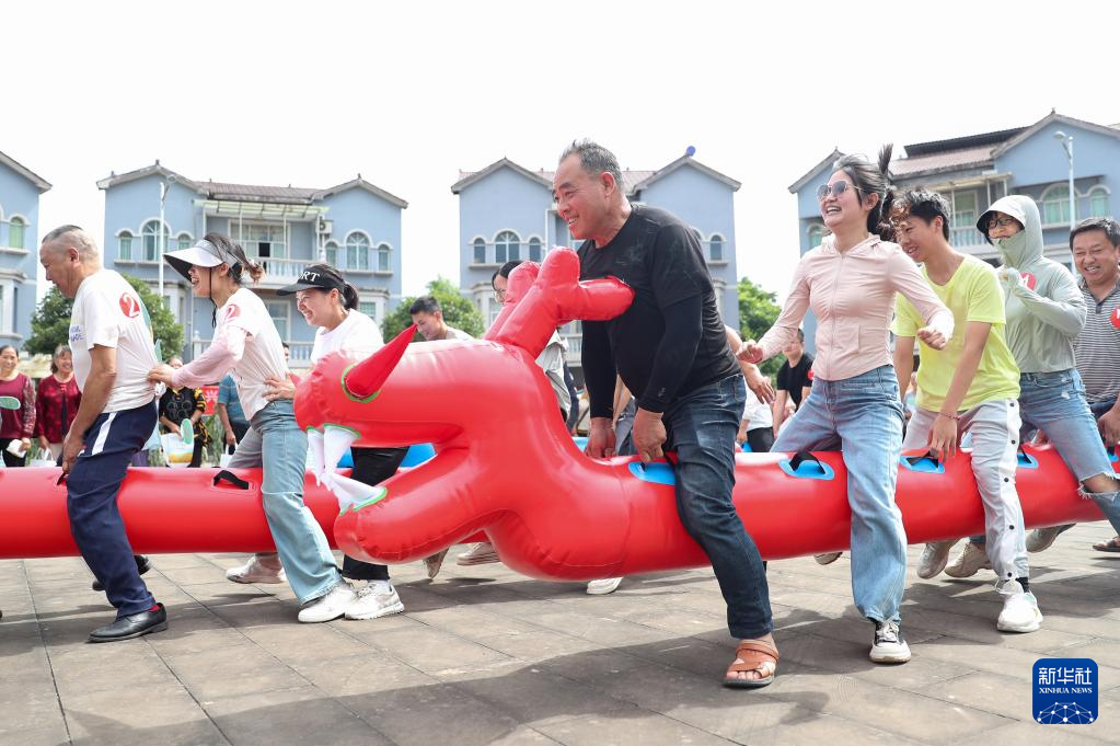 6月6日,四川省华蓥市高兴镇的群众在参加划旱地龙船趣味项目比赛。