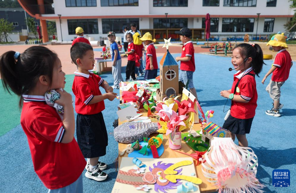 这是老师和孩子们用废旧报纸及包装纸制作的创意纸艺作品(6月13日摄)。
