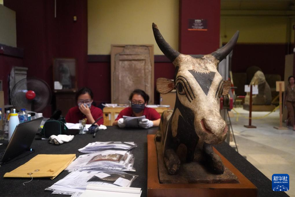 这是5月23日在位于埃及首都开罗的埃及国家博物馆拍摄的一件将要打包的文物。