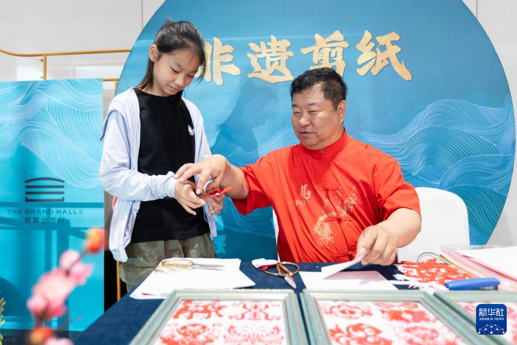 6月16日,在上海世界会客厅互动体验区,上海市群众艺术馆剪纸师指导儿童制作剪纸。