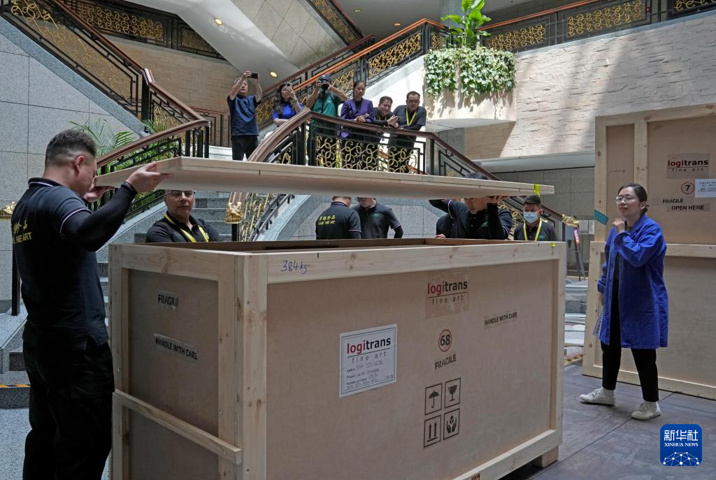 6月17日,在上海博物馆人民广场馆,工作人员打开彩绘人形棺的包装箱。