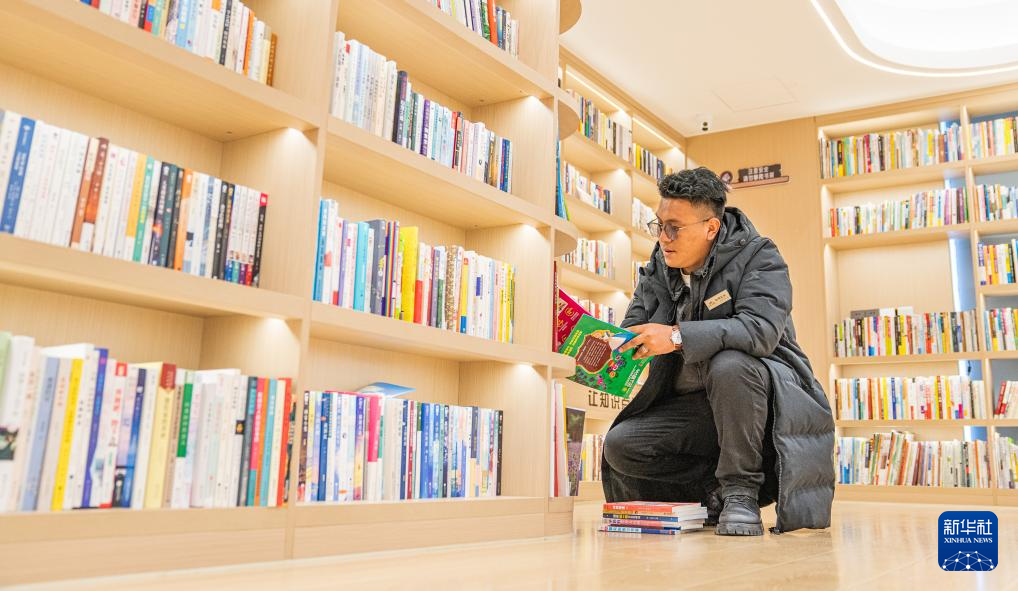 “温暖嘉·色尼城市书房”管理员白玛扎西正在整理书籍(6月17日摄)。