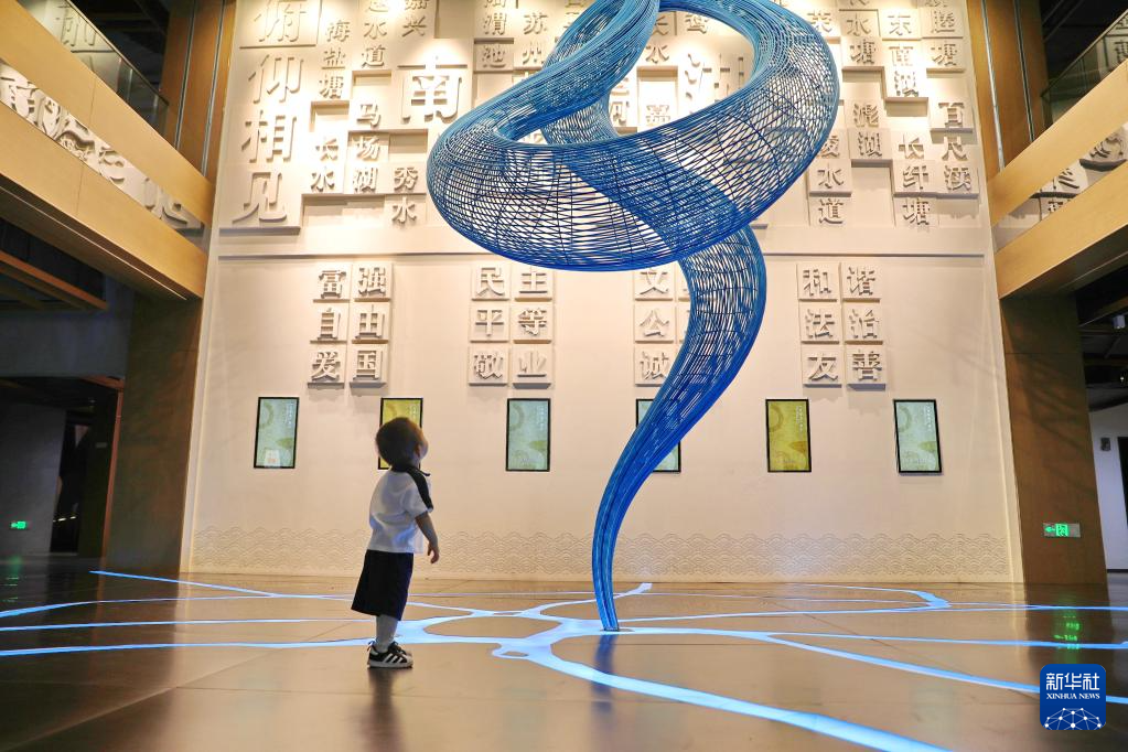 6月29日,小朋友在芦席汇历史街区“大运河数字诗路e站”观看“俯仰相见”雕塑。