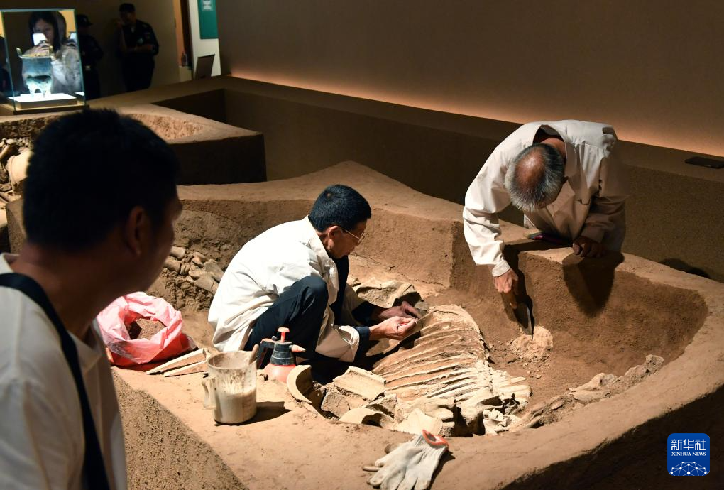 7月1日,两名工作人员在殷墟博物馆新馆展区开展维护保养工作。