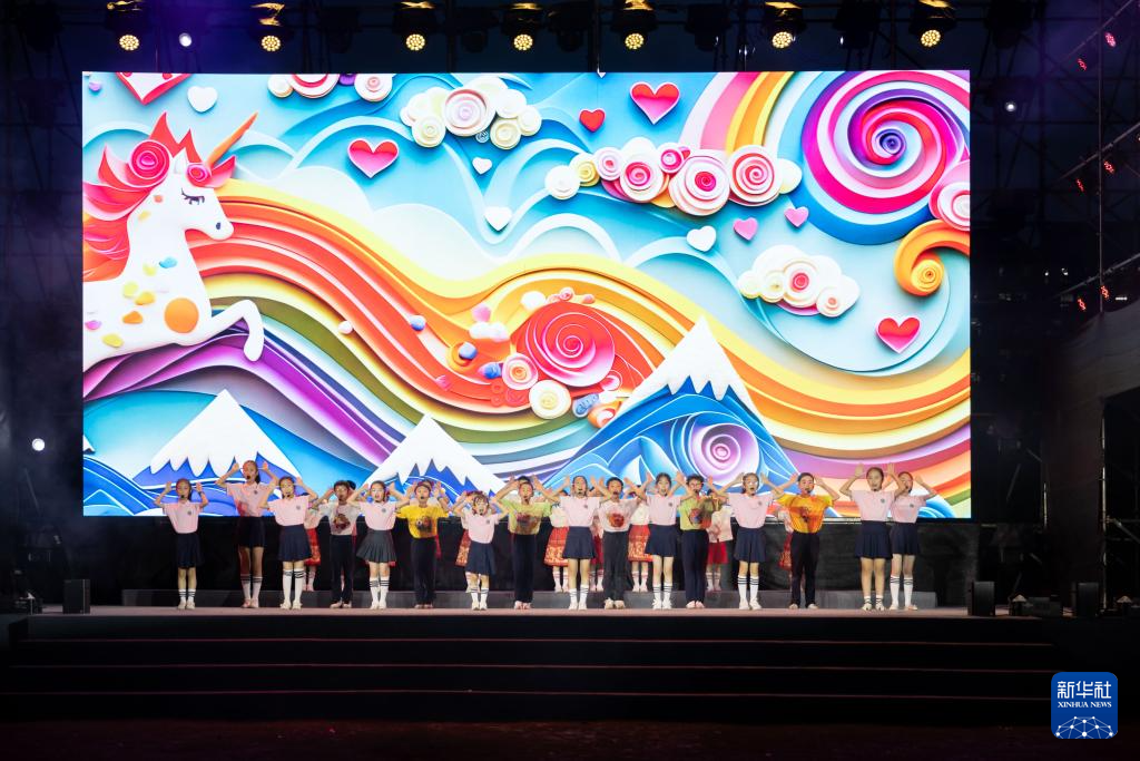 7月2日,上海师范大学附属闵行第三小学合唱社团与浦锦街道童声合唱团共同演唱歌曲。