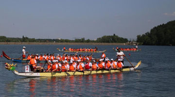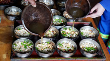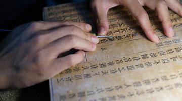 7月3日,工作人员(左)在向参观者讲解一组马可·波罗相关文献资料的展品。