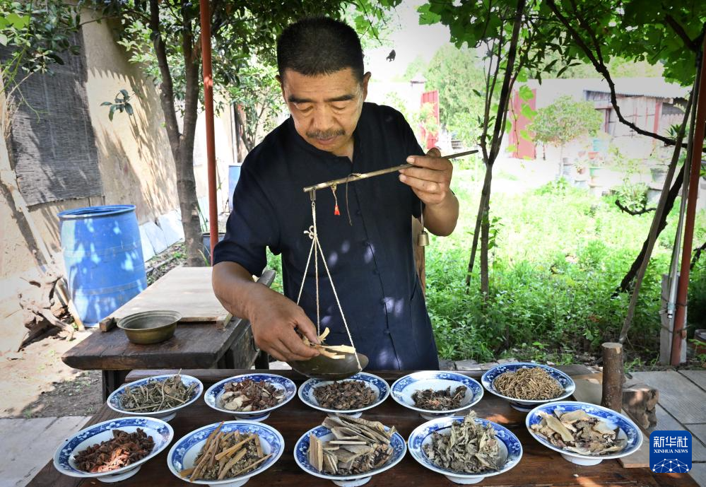 张书芳在选取香材后称重配比(7月3日摄)。