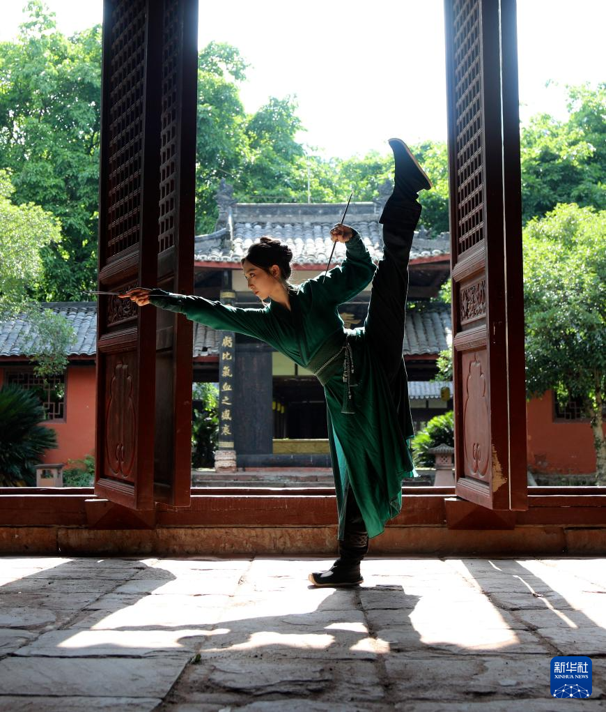 峨眉山市往北约两公里的飞来岗上,坐落着一座依山而建的大庙飞来殿。十来名身着“峨眉青”劲装、手持峨眉剑/刺的妙龄女子步履匆匆,径直推开厚重的朱漆殿门,眼前一殿高过一殿,竟别有洞天。一直抵达最深处的清虚园,这群侠女才散开,各自演练起来,声声娇叱瞬间刺破了青山翠谷、广宇古刹的幽静。剑气纵横,拳拳生风,一招一式似柔实刚,恍如峨眉派重现江湖,又似一幅鲜活的水墨画。