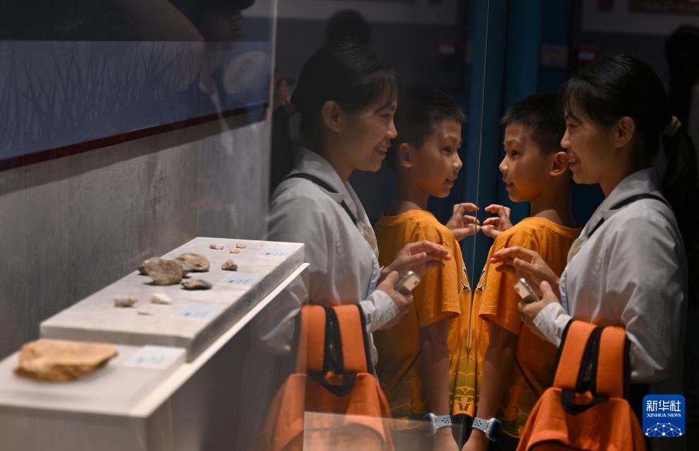 7月30日,一名小朋友在展览上观看“北京人”复原像。