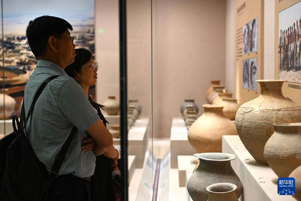 9月1日,游客在宁夏博物馆观赏新石器时代陶罐。