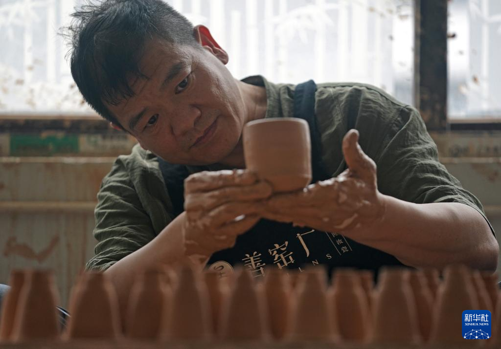 在位于江西省景德镇市善窑厂的车间里,李善明在进行拉坯(8月28日摄)。